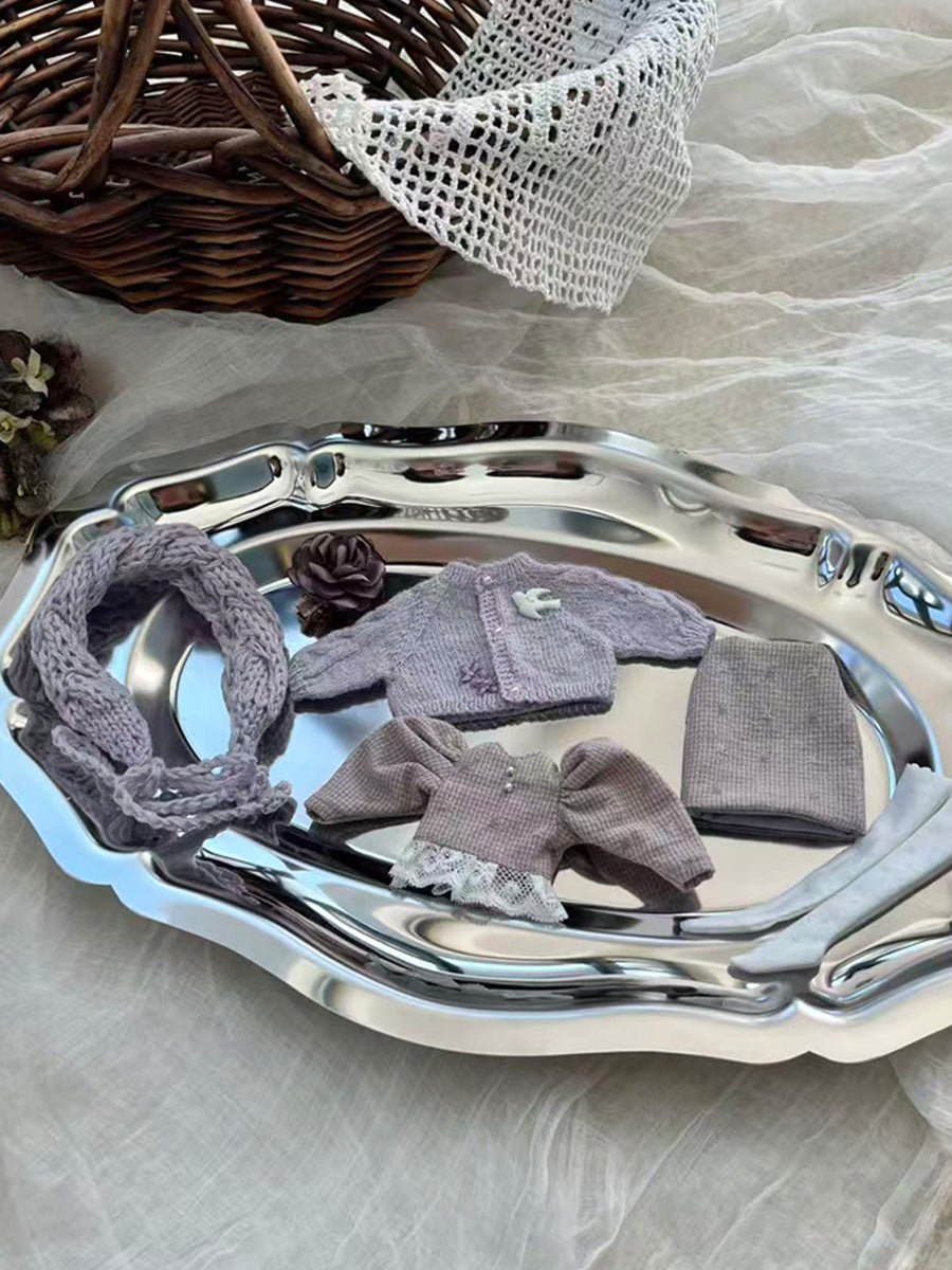 This listing includes 5 pieces: Knitted headband, floral hair clips, purple sweater, plaid top, skirt, socks. Other items and/or dolls are not included.
